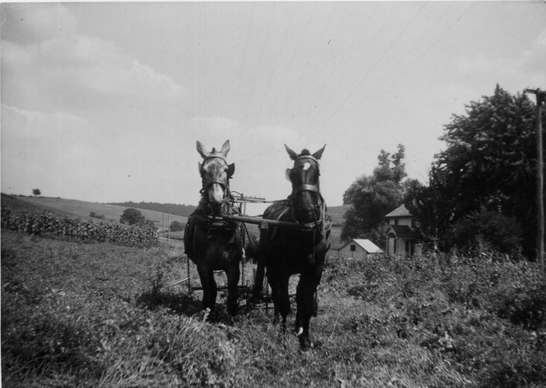 1942. A mule and a horse pull Russell Warner’s lawn mower.