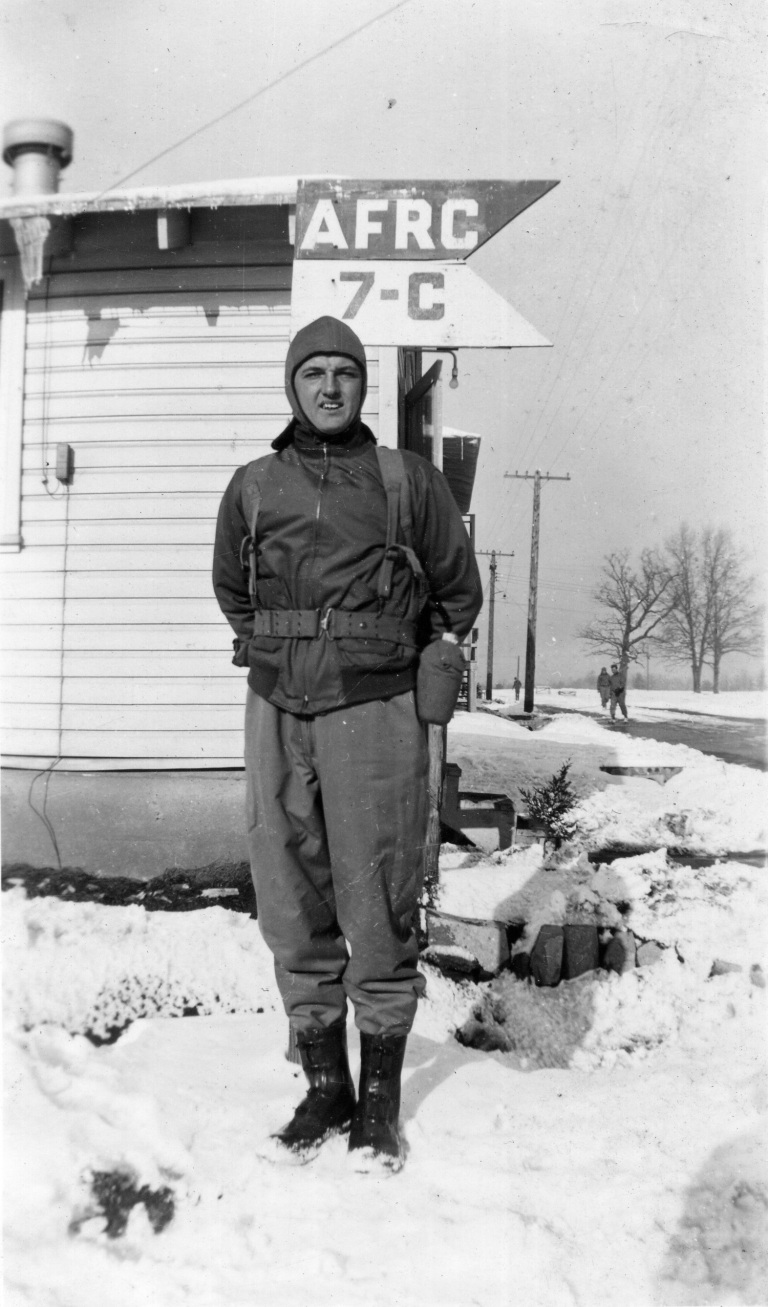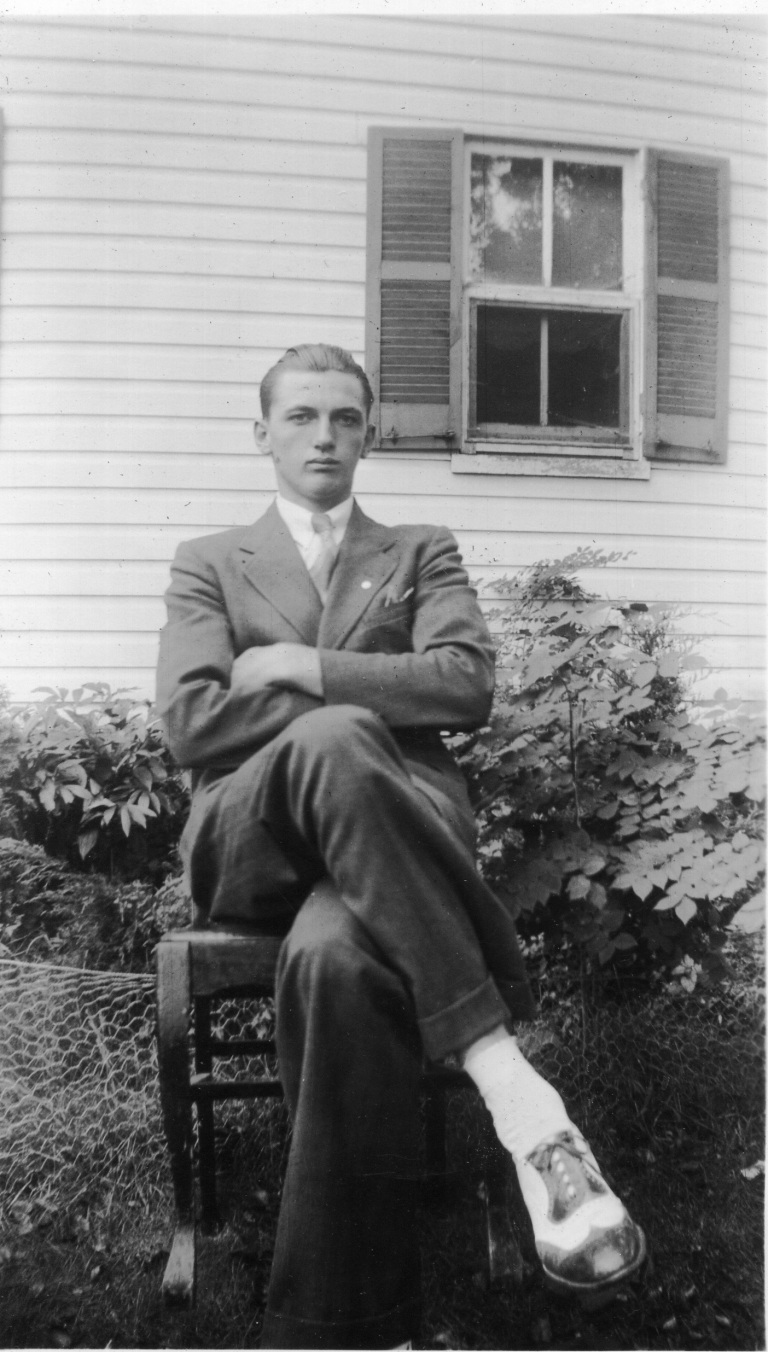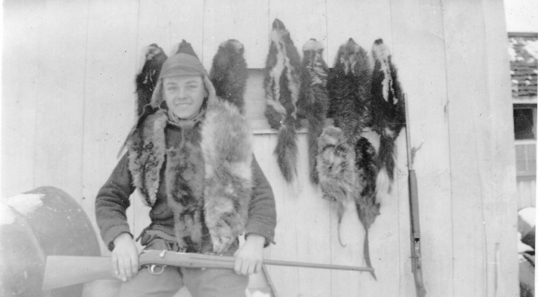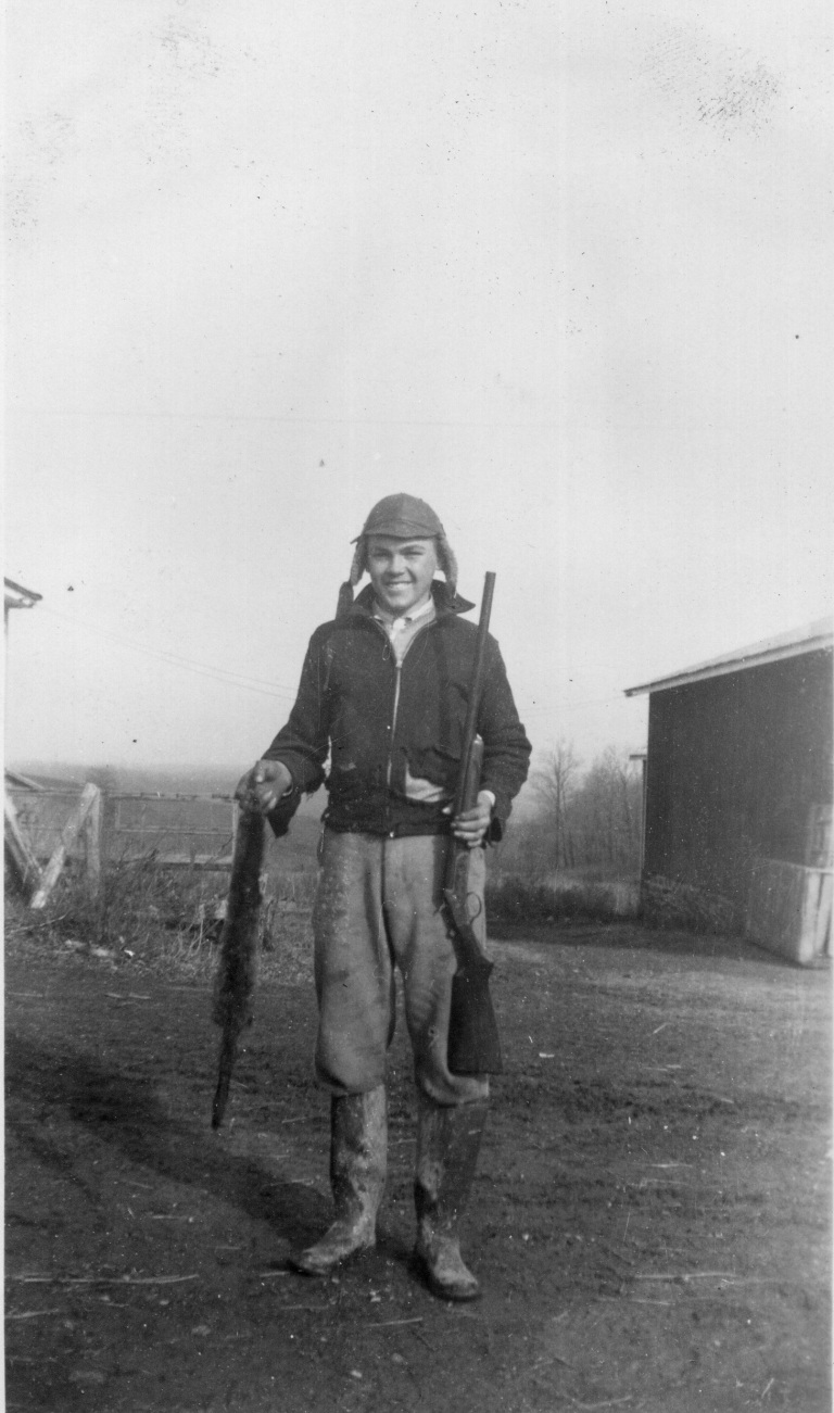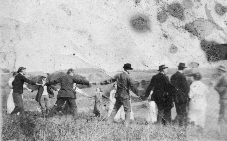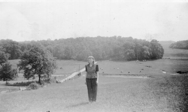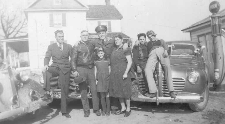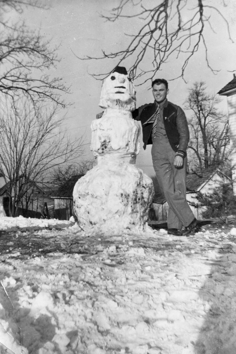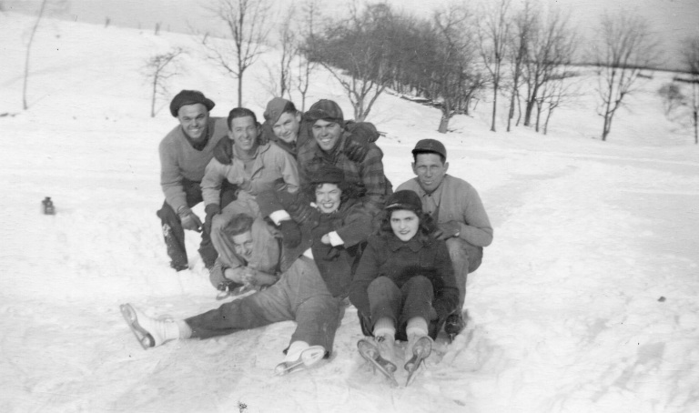 1948. (Pictured left to right) Francis Bollinger, Carolyn Nightingale, David Brauning, Audrey Bollinger, N. Gist, T. Jones, Irvin Kibler, Edna Bollinger, Stanley Bollinger, Gordon Bellson, Albert Bellson, George Bollinger, and Jim Beard ice skate and laugh together on Bollinger Pond.