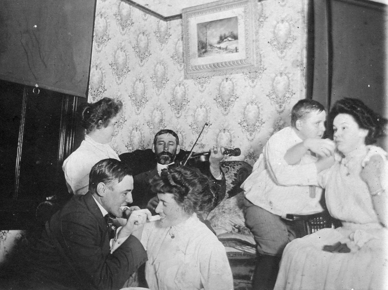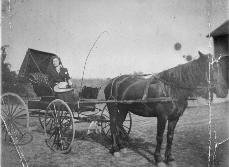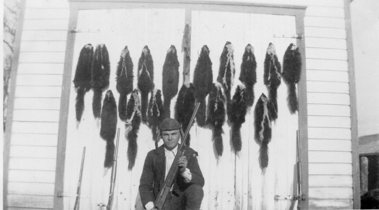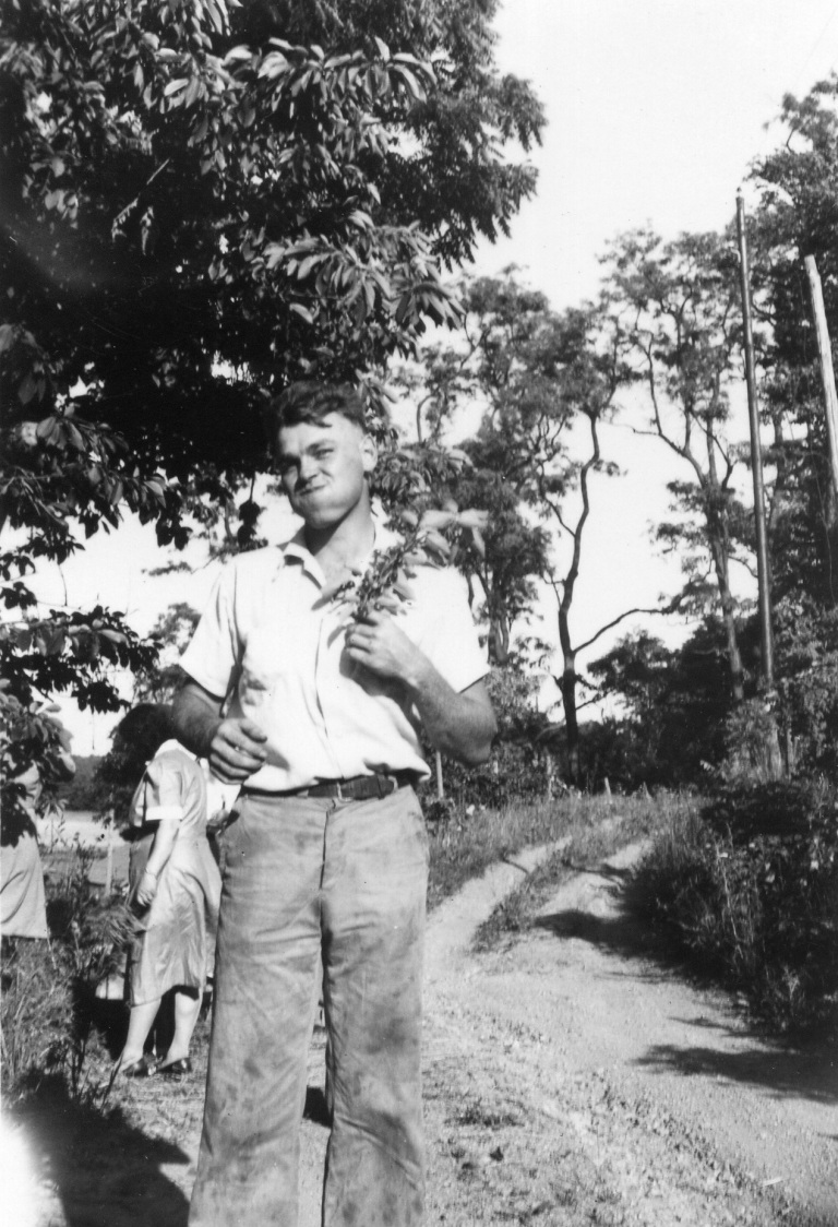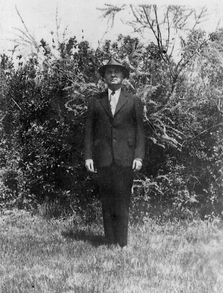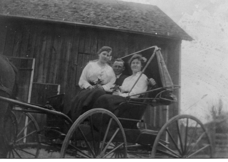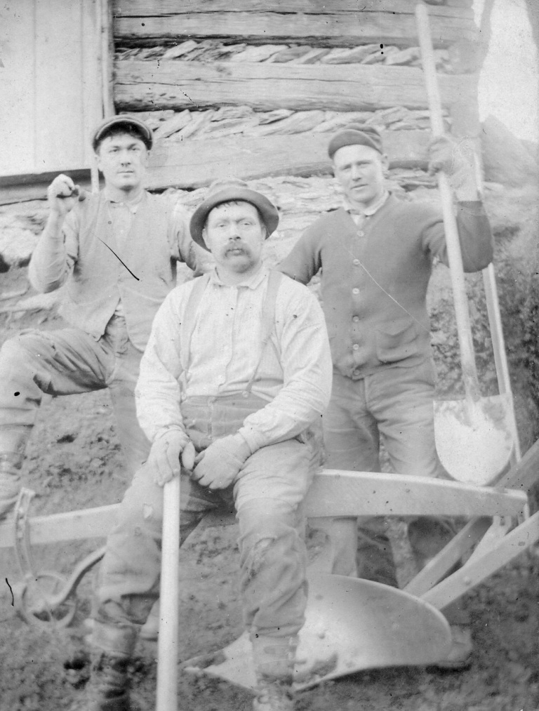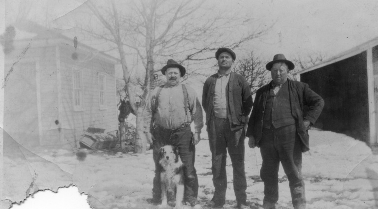 (Pictured left to right), Edward Bollinger Sr.; Hayden Bollinger; and an unidentified man sit for a photograph in between their work on a Bollinger Farm.