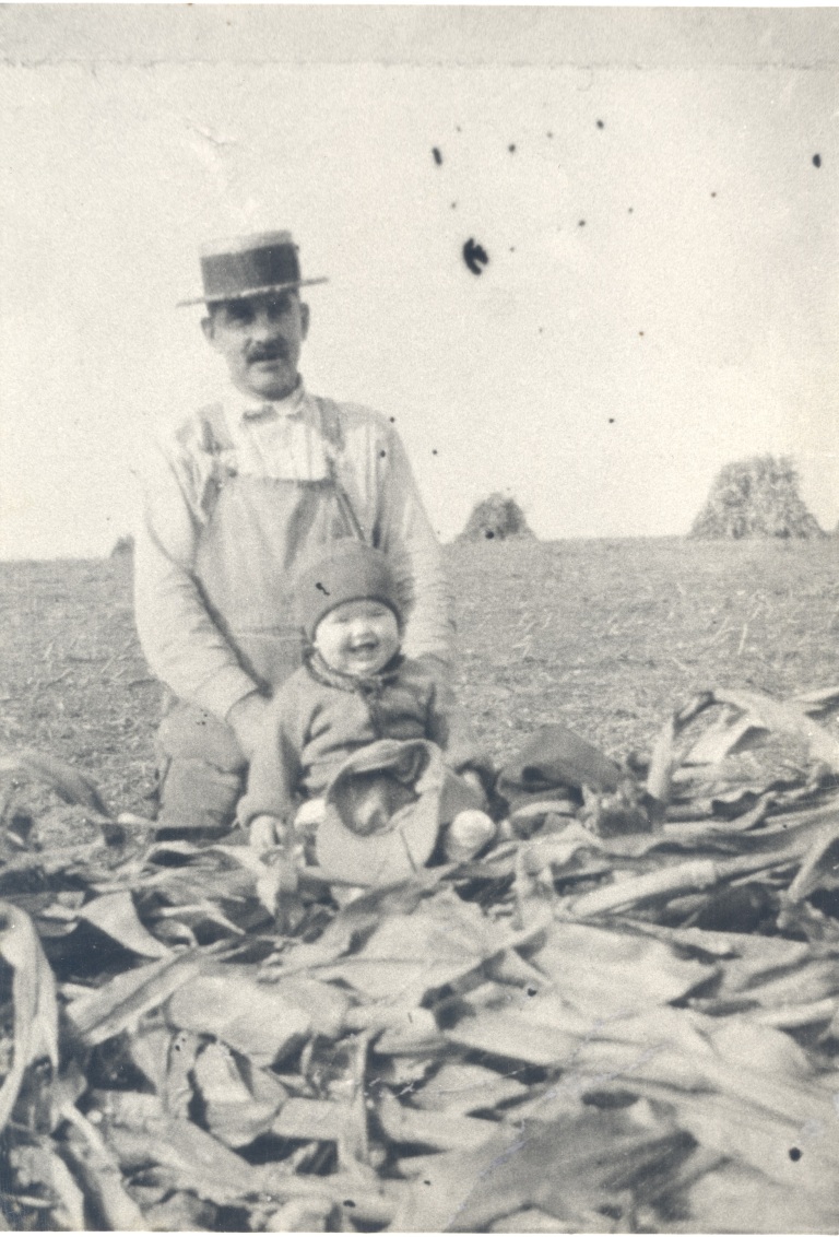 1928. Oliver Brown and his 1 ½-year-old daughter during corn husking season on their 60-acre family farm.