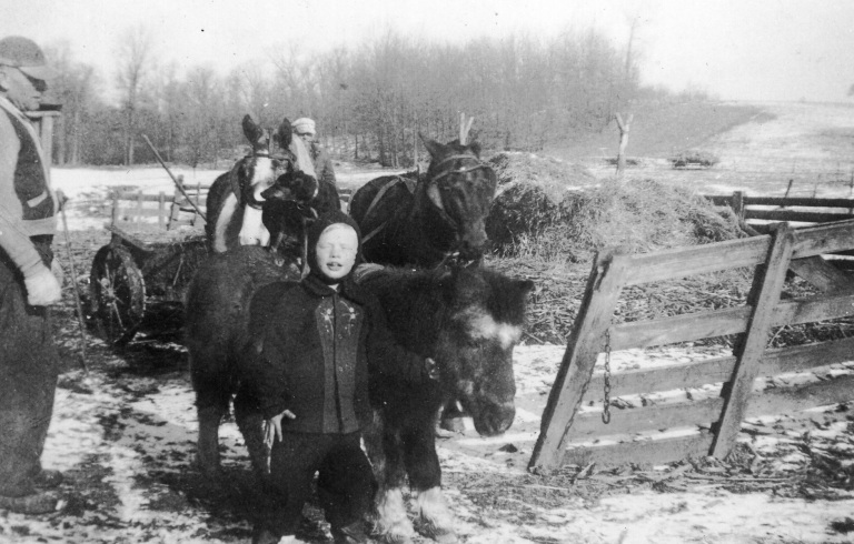 circa 1952. Gordon Conaway Sr. and Gordon Conaway Jr. (Bill) hook up their horse, Nellie, to a sleigh on the Conaway farm in Berrett.