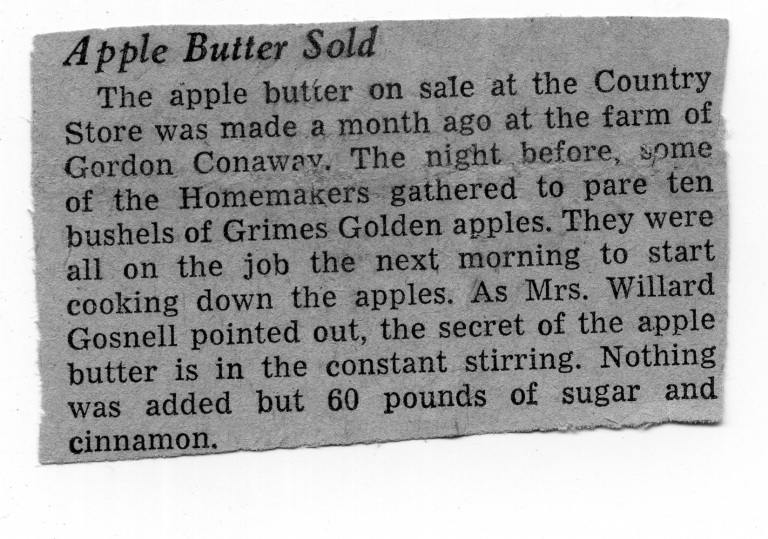 1955. The Berrett Homemakers (with Mrs. Barrett pictured on the left) meet on the Conaway farm in Sykesville to make apple butter.