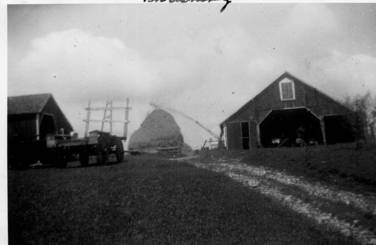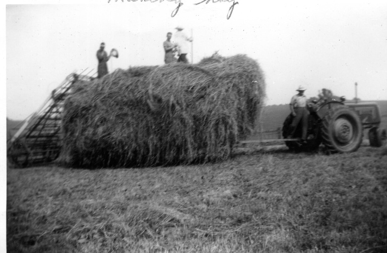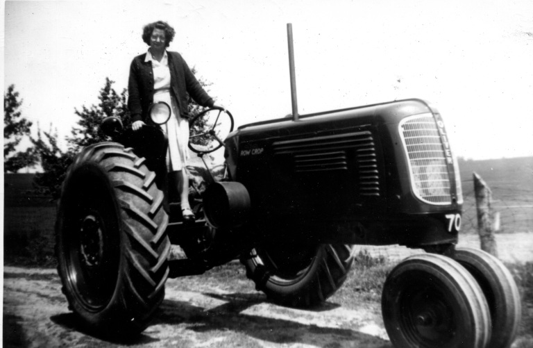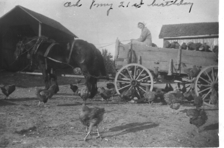 circa the 1940s. Ruth Hoff pictured on the family farm wagon on her 21st birthday.