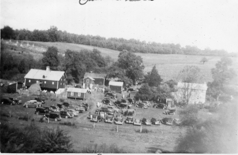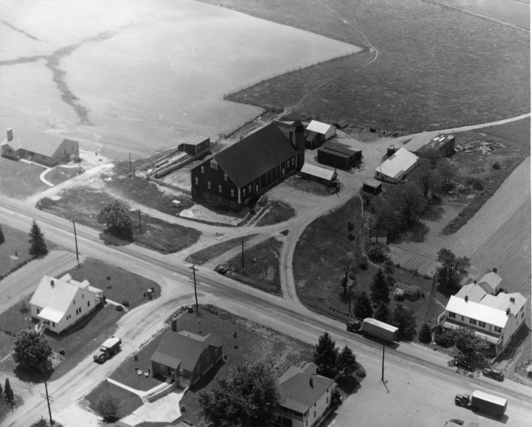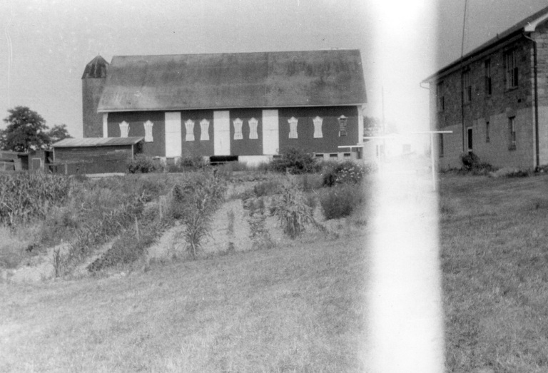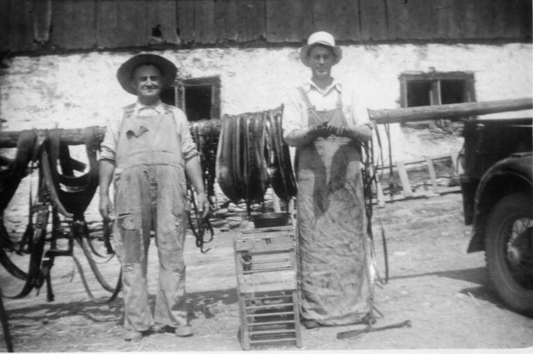 circa the 1940s. Francis and Herman Hoff pictured greasing harnesses at their farm in Gamber.