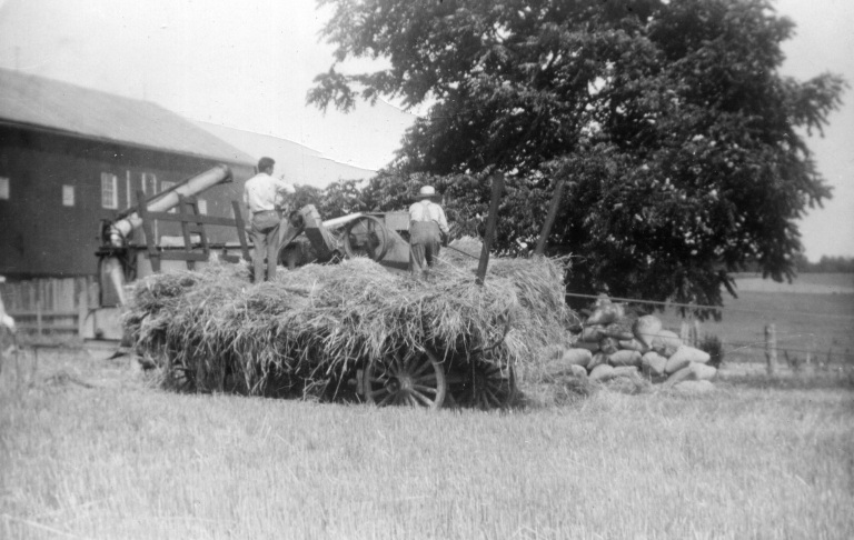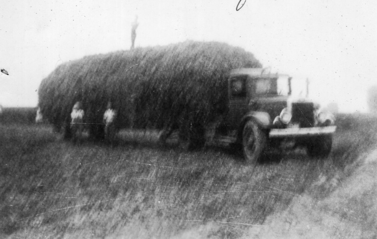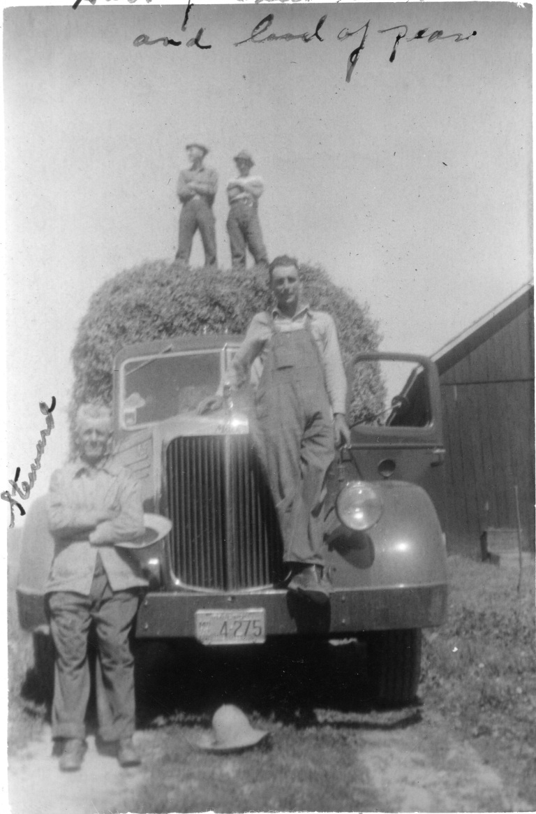 1941. Harvey Shipley and Herman Hoff pictured with a truckload of peas on their way to a cannery.