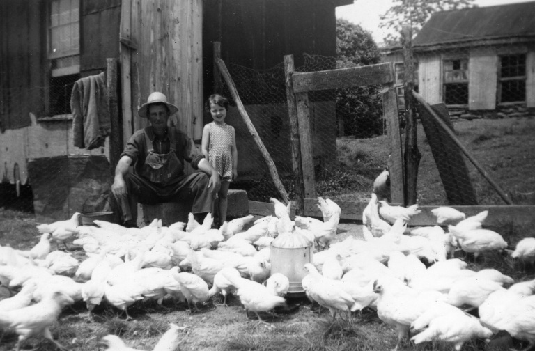 1951. Herman and Bonnie Hoff (later Fold) in the chicken yard on their Gamber Farm.