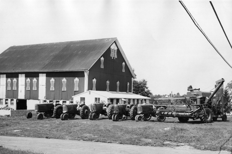 (pictured left to right) Donald Hoff, Wilfred Hoff, Paul Hoff, and Carl Hoff sit on their tractors on the Paul and Ruth Hoff farm.