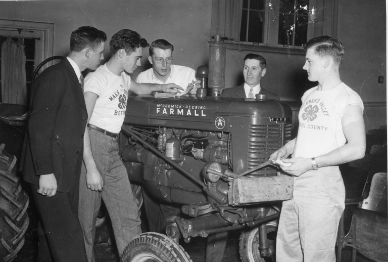 1947. (Pictured left to right)Stewart Young, Gary Brauning, Charlie Brehm, John Young, and Solomon N. Hoke, meet as a part of the 4-H Tractor Maintenence Club.