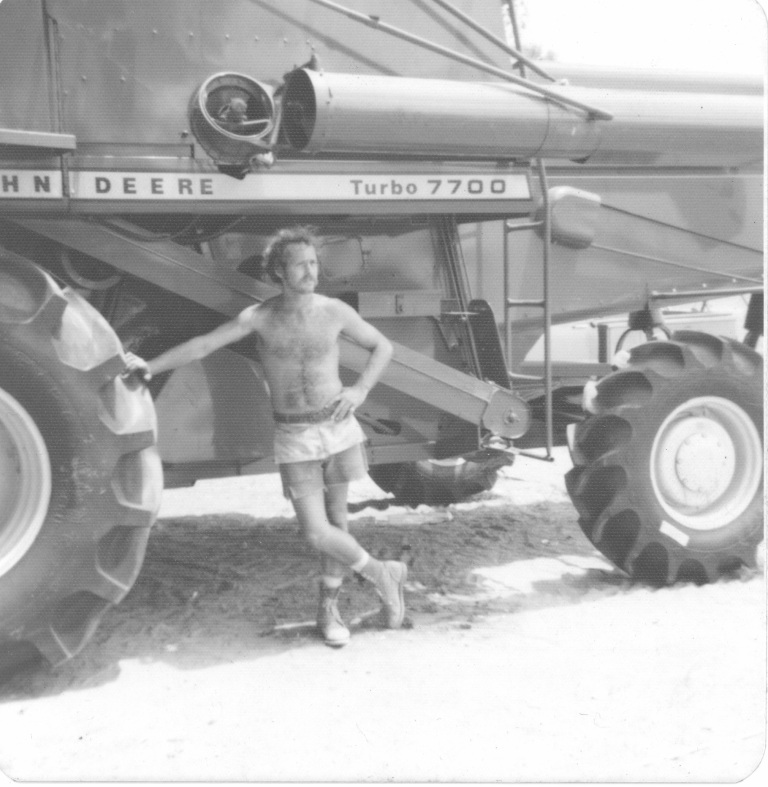 1973. John Kable leans on a combine. Kable and William Finch Jr. were frequently flown around the country for their keen ability to quickly put together farm equipment, with one story saying that they could put together a combine in 6 hours compared to an entire auto shop taking 40 hours to do the same job.