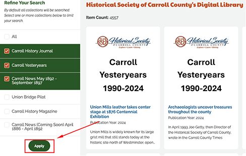 - Filter by Author (coming soon!): For publications with a listed author like, Carroll Yesteryears, you can also limit your search to specific authors.