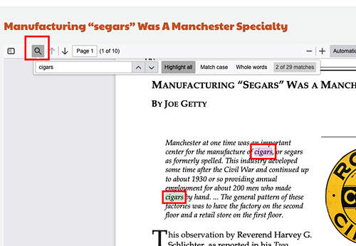 - Searching Inside Documents: Our Keyword search will locate documents with your desired term. For quick searches inside documents, click on the magnifying glass in the document viewer’s top left corner, type in your term, and find your term matches highlighted throughout the document!